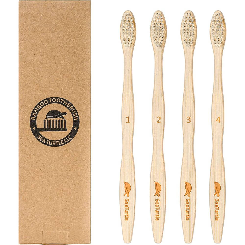 The pack contains four numbered toothbrushes, perfect for a year's supply or for sharing among family members. Doctors recommend changing your toothbrush every season, so this pack caters to your oral health needs throughout the year. Additionally, the minimal packaging reduces waste, with the toothbrushes packaged inside a single recyclable box. If bristles become bent during shipping, simply soak them in hot water to regain their original shape. Choose SeaTurtle Plant-Based Bristles Bamboo Toothbrushes for a greener and healthier smile!