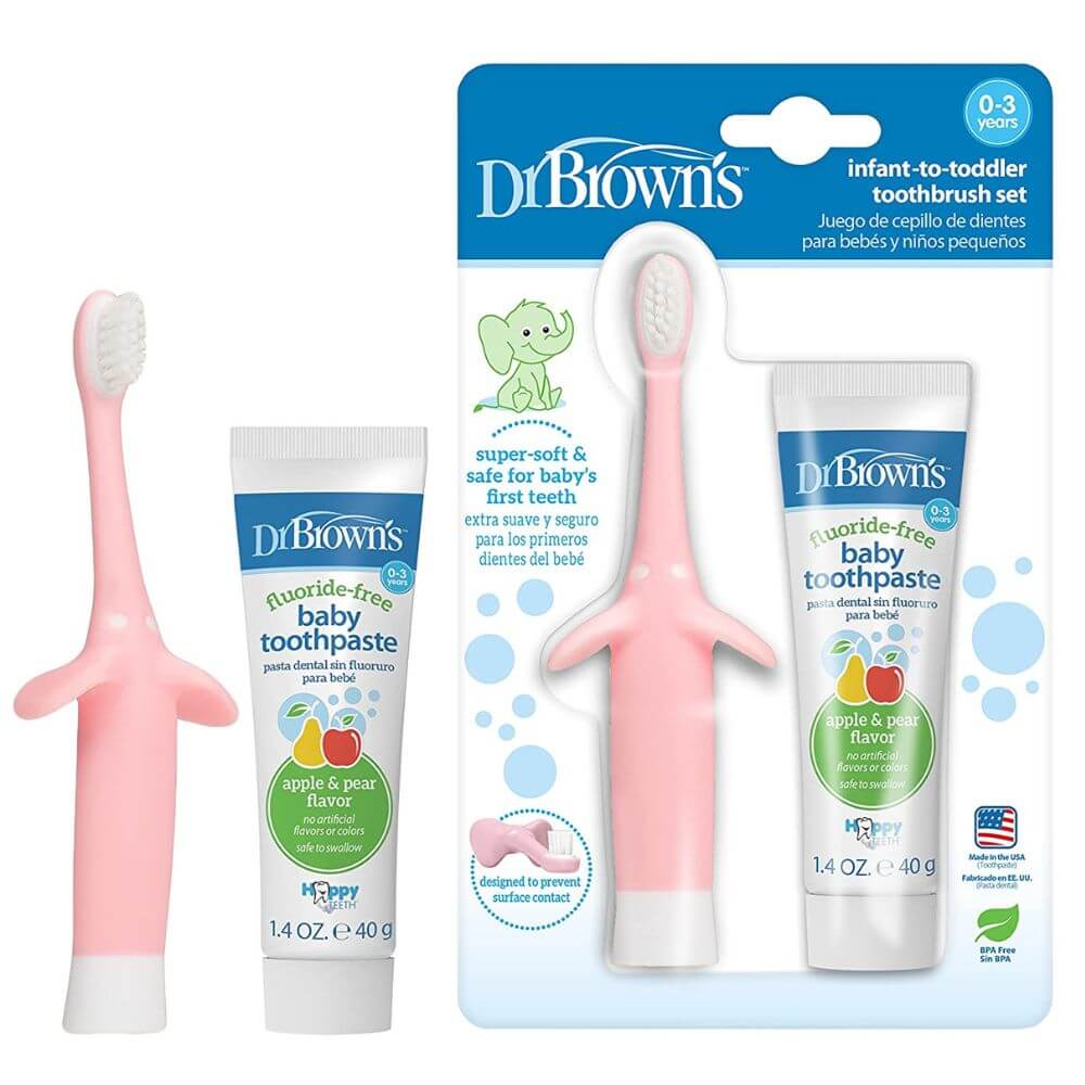 Dr. Brownβs Infant-to-Toddler Training Toothbrush Set, Pink Elephant with Fluoride-Free, Toothpaste, 0-3 years