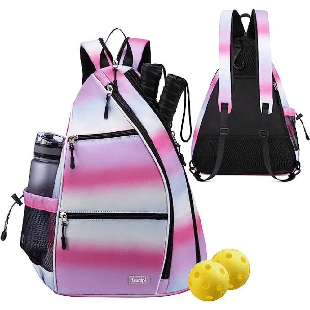 Plus, it has a hidden anti-theft pocket to keep your valuables safe while you're playing - perfect for on the go! With its adjustable straps and stylish design in pink rainbow colorway, this pickleball bag is both functional and fashionable.