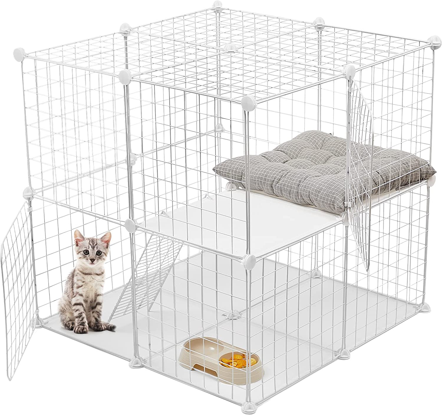 The cat crate is easy to put together and take apart. You can arrange the crate to meet your specific requirements and create various fence shapes and functions. To increase stability, insert the corners of each panel into the connectors using a hammer. The package includes 18 panels measuring 35 x 35 cm, 2 dense door panels, and 6 panels, along with a ladder and 27 buckles for assembly. Once assembled, the crate will measure 70 x 70 cm or 27.56 x 27.56 inches. This cat crate is durable and provides a secure environment for your pet to play, sleep, eat, and exercise. It helps keep your space tidy and protects your pet from getting lost or hurt.