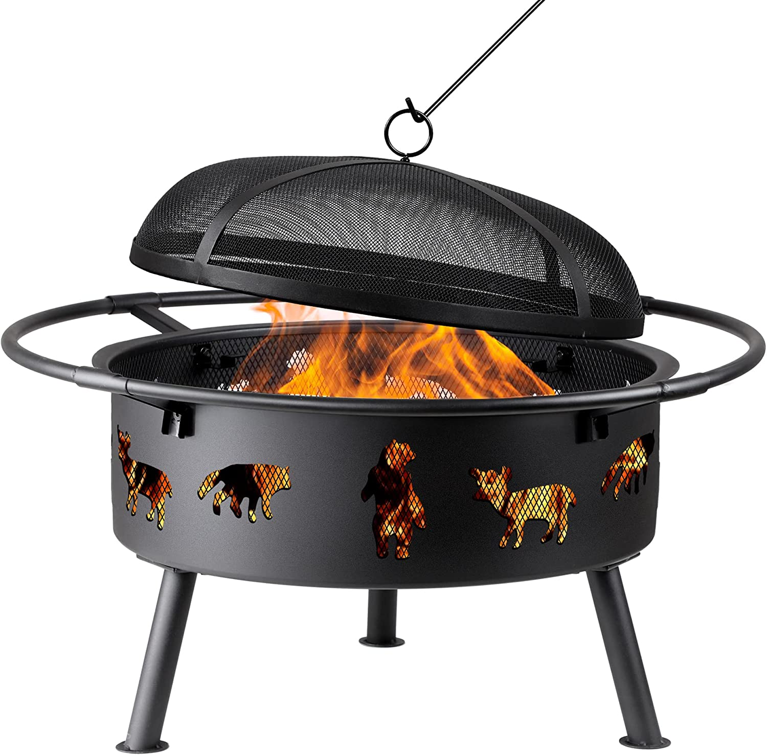 This fire pit has a spacious fire bowl with an internal diameter of 27" and a height of 11.6". Constructed from thick steel with a durable, high-temperature-resistant coating, the bowl can accommodate larger logs and facilitate larger campfires. To enhance ventilation, the mesh spark guard design allows for more airflow, while the burner support rods at the bowl's bottom increase airflow and sustain the fire.
